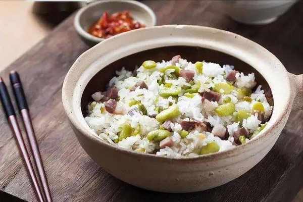 豆焖饭是选用刚摘下的鲜嫩蚕豆,剥壳去皮留下豆米,熟火腿切成指甲大小的片,再把上米掺入二分之一糯米掏洗干净,煮熟控出米汤。