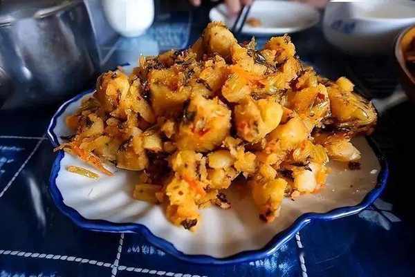 老奶洋芋是云南美食之一,制作简单方便。将煮熟的土豆剥皮后,将其研成泥状,然后放入锅内用少许动物油炒,并加少许葱花。