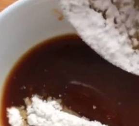 接下来准备料汁,在碗里加入耗油、番茄酱、鸡精、味精、再加入一勺淀粉,再加入适量清水,调成汁备用。