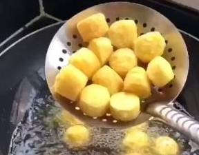 热锅加入食用油,四成油温,把豆腐放进去,用小火慢炸,炸至表面金黄酥脆,盛出,沥干油,备用。