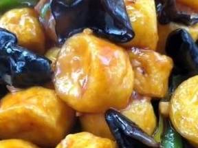 锅里留底油,加热,准备葱、姜、蒜末,加入锅里炒香,在准备一些青椒,青椒去籽、洗净,切成小片,木耳泡发,切成小块,洗净。木耳可以先煮一下。把木耳和青椒放入油锅,翻炒均匀,再加入炸好的鸡蛋豆腐。