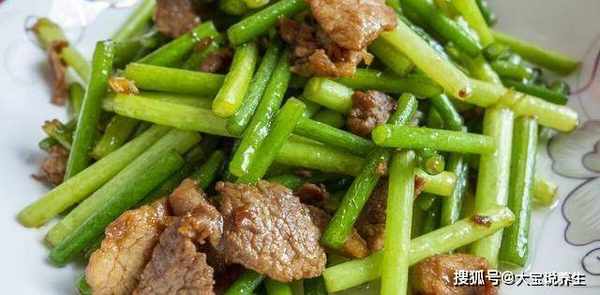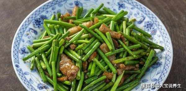 注意炒蒜苔和焯水的时候要加调料,蒜苔色绿软嫩,味道鲜美。