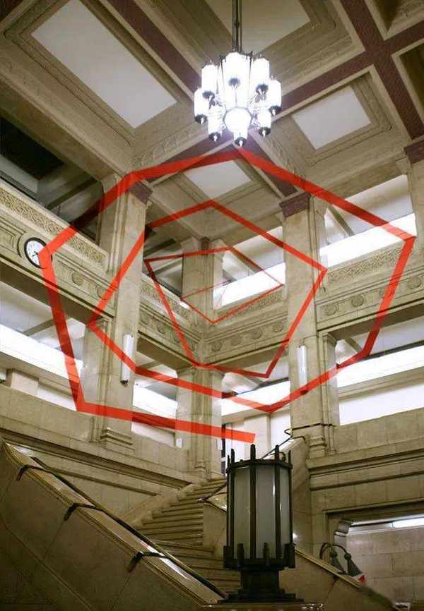 这些作品看似只是几何线条的拼凑和堆积,但其实每一个图案都需要艺术家精确的计算,以及具体实践中对空间、景深和投影的把握。而当观众站在了最佳角度的同时,艺术家也与观众进行了一场时空的对话。