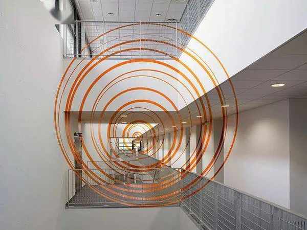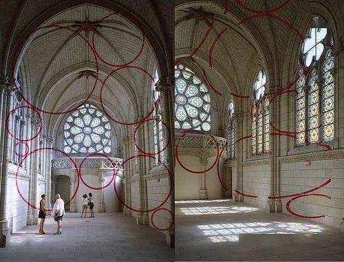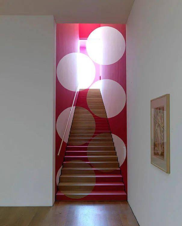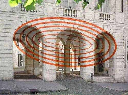 整个城堡都笼罩着一种奇妙的视觉差之中,这些同心圆如同波浪一般在整个空间中慢慢展现,只有在特定的角度时,破碎的圆圈才能形成一个完整体。