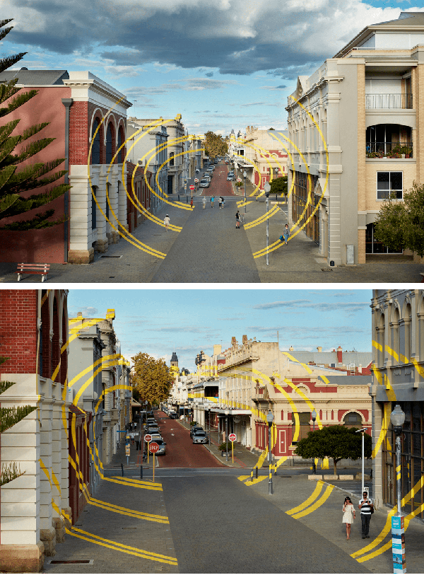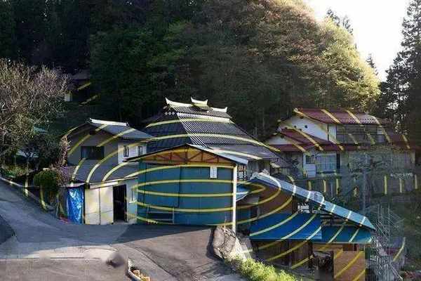 乍一看,这些破碎的圆圈就像散落的一些碎片,毫无逻辑和秩序,但其实观看者站在某一个精准的角度望向小镇时,所有图案就会在空间内形成一个非常立体的形象。