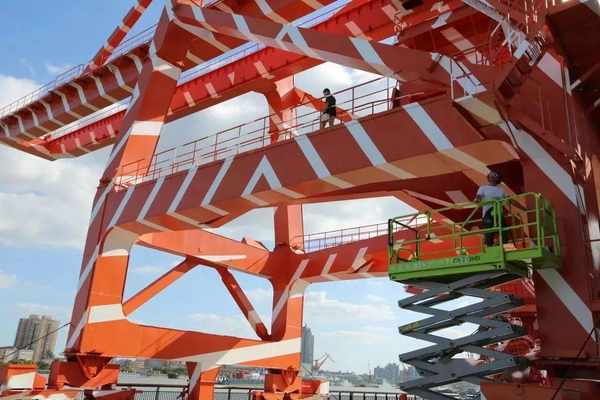 这件作品就地取材,依托江边原有的工业遗存,橘红色的起重机上布满了白色的几何线条,只有当参观者走到某一个正确的角度时,所有的直线才能够被连接起来,形成完整的图案。而找到正确的地方观看,正是艺术家和公众玩的一场“捉迷藏”游戏。