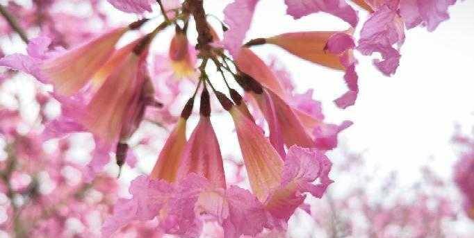 紫花风铃木的花朵为管状喇叭形,簇生,一个花序大概有10朵花。每一朵花的盛开时间大概持续10天,每一棵树的花期可达30多天。我在马克村游览的时候,很多花朵已经开始飘落,有部分紫花风铃木也快过了盛花期,开始变得稀疏。想要赏花的可要抓紧时间。
