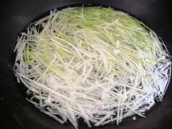 2、萝卜清洗干净擦成细丝,锅中加入适量的水,水开后先加入一小勺食盐,再放入萝卜丝焯水至变软,去除萝卜的辛辣味。