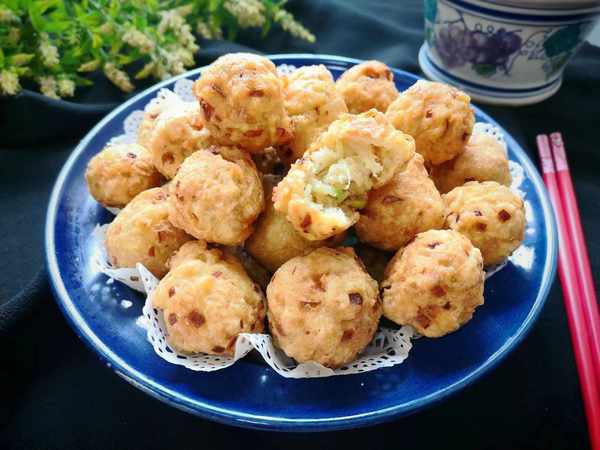8、最后丸子慢慢飘起来,颜色炸至金黄色就可以出锅了,控油捞出,香酥不油腻,比肉丸子还好吃。
