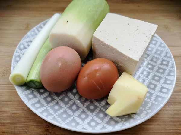 食材:豆腐、萝卜、大葱、生姜、鸡蛋、红薯淀粉、盐、五香粉、香油。