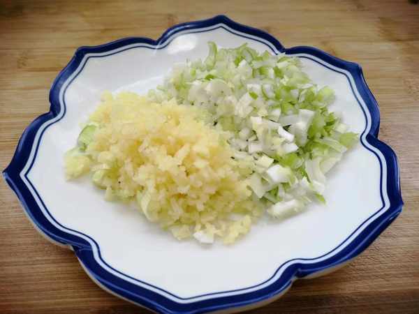 3、大葱洗净切成葱花,生姜切成姜末,装盘待用,大葱可以适当多一些,炸出丸子味道更香。