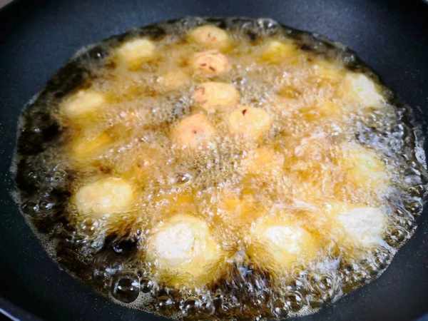 7、锅内加适量油,油温6成热转小火放入丸子,要马上翻动,等丸子定型微微变黄再翻动,全程要小火慢炸。