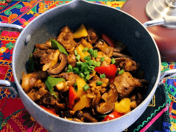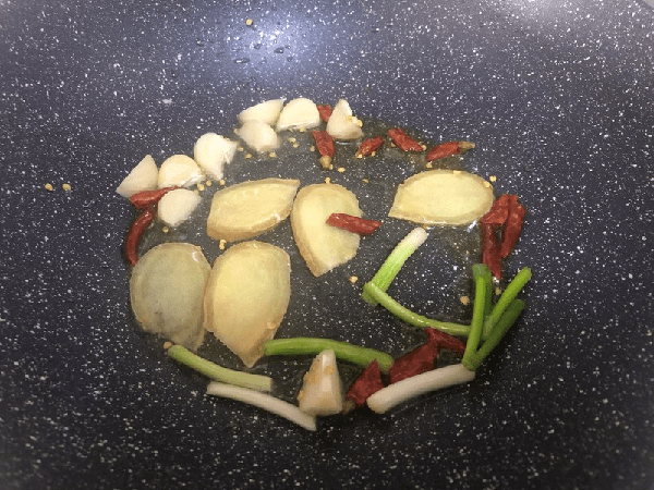 4、所有配料都下锅炒香,然后加香菇、鸡块翻炒。