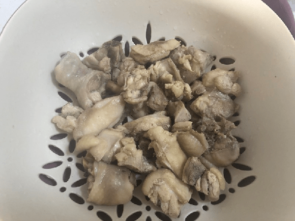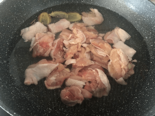 2、鸡腿切块冷水下锅,加姜片煮开,捞出用温水洗净。