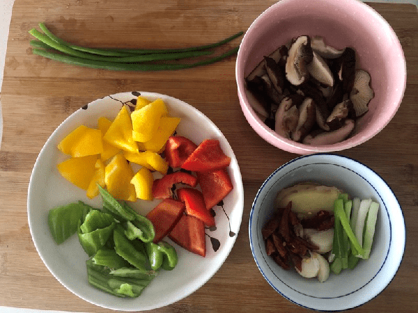 1、彩椒切块,干香菇泡发,姜蒜切块,葱切段,干辣椒切段备用。