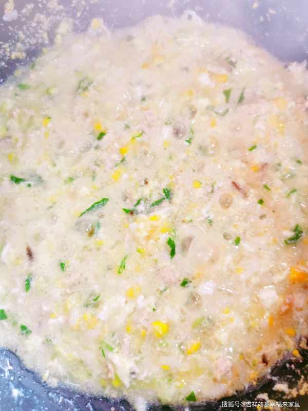 甜玉米清洗干净后,用刀直接切下来的颗粒即可,千万别把玉米切的太碎,容易吃起来有麸质感,不好吃,大颗粒的就可以,把青菜清洗干净后,切细丝,土豆削皮清洗干净后切碎成小颗粒,猪肉和香菇清洗干净后,尽量切碎成泥,大米直接淘洗干净即可,所有食材准备好之后,一起放入锅中,加入水,一起煮至食材软烂即可。