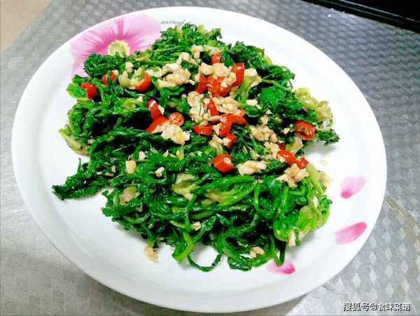 3、按照个人的口味,简单调一调,荠菜上面放蒜末和小米椒,淋入热油激发出香味,放入少许的生抽、香醋、食盐和鸡精,拌匀即可开吃,鲜香美味,营养丰富。