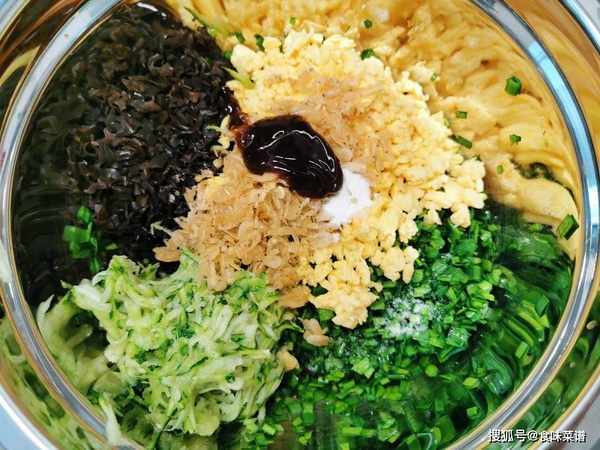 1、准备一把鲜嫩的韭菜,清洗干净,放入盆中,同样加入黑木耳、鸡蛋、虾皮和西葫芦丝,调味加入适量的蚝油、食盐、五香粉和芝麻香油,顺时针搅动均匀。