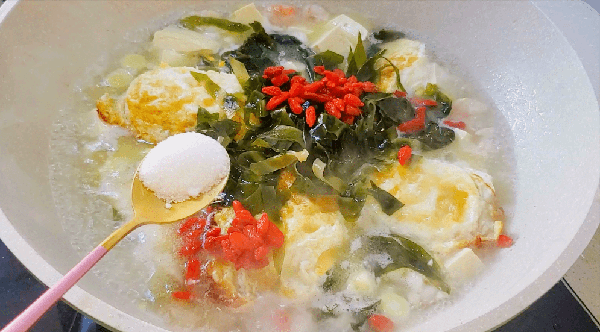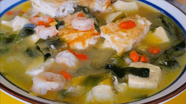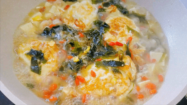 5、再放进豆腐,海带,枸杞,调味盐,鸡精,盐蚝油,胡椒粉煮上3分钟,临出锅的时候倒进适量的小磨香油,搅拌均匀,美味的海带豆腐虾仁鸡蛋汤就做好啦!鸡蛋,虾仁,豆腐都是补钙的高手,和海带搭配在一起真的是营养翻倍呀!喝一口简直是回味无穷,汤鲜味美,越喝越上瘾,上桌大人孩子抢着吃,太香啦!