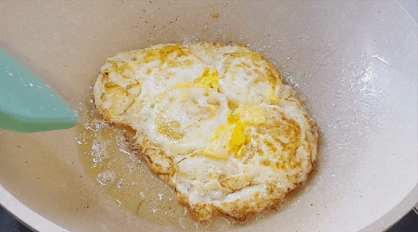 3、空碗中打入4个笨鸡蛋,锅中油烧热倒进鸡蛋,煎至两面金黄,分成小块,盛出来备用。