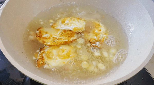 4、另起锅加油,油热放进提前切好的葱花,姜末爆香,爆出香味放进洗净去虾线的虾仁翻炒,虾仁炒至变色,倒进滚烫的开水,这是汤汁奶白的关键,然后放进鸡蛋。
