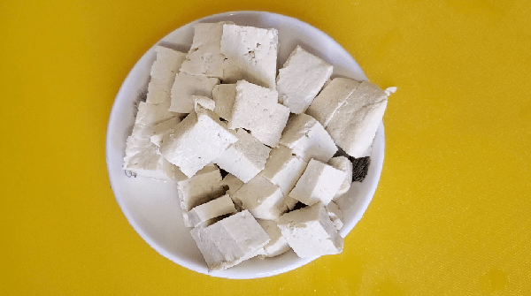 2、豆腐切成小块,放进盘中备用。
