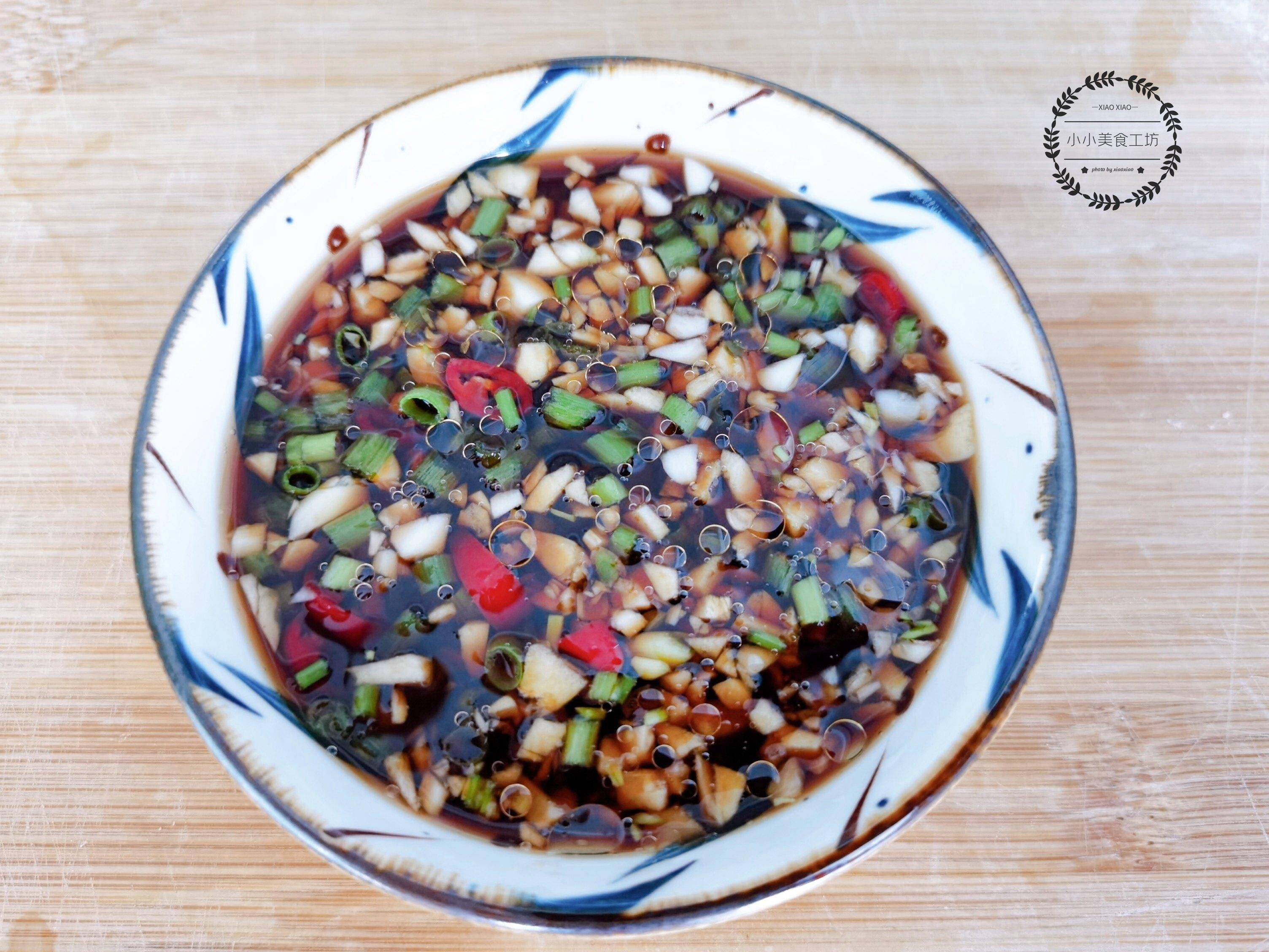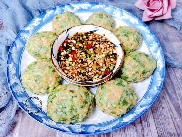 4、用蒜末,葱花,小米辣椒和生抽,香醋,香油来调制一个蘸水,将蒸好的菜团蘸着蒜汁来吃,开胃又可口。