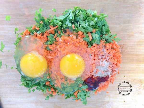 1、将茼蒿和胡萝卜洗净后切碎放入盆中,加入2个鸡蛋,再加入调料食盐,胡椒粉和蚝油,充分搅拌均匀。