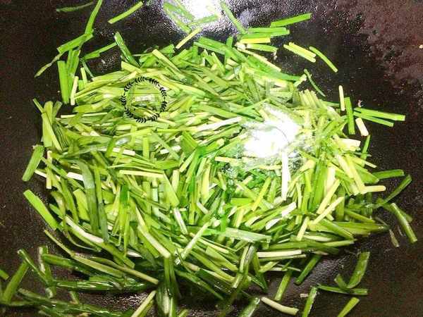 2、锅中倒入食用油,放入韭菜炒至变软后加入少许食盐和白糖拌匀。