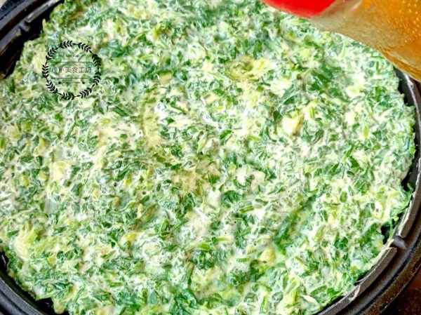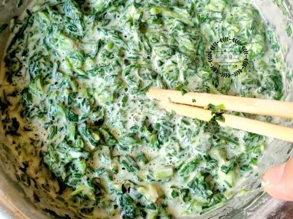 2、在荠菜碎中打入2个鸡蛋,少许食盐和面粉,直到搅拌成浓稠的面糊。