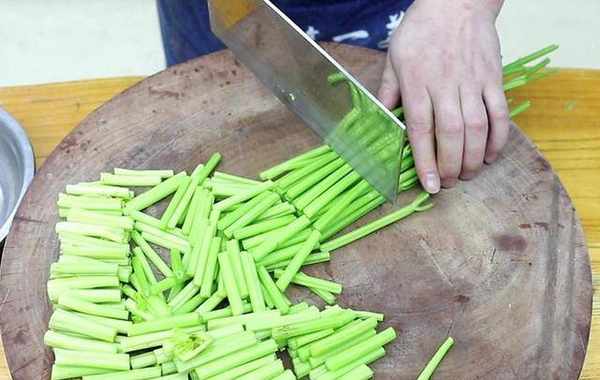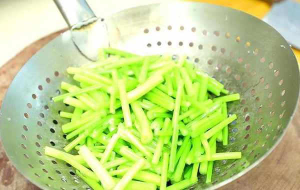 3.锅内烧油,放入芹菜段进行煸炒,加入一勺食盐,少许味精调味,开大火把芹菜炒至六成熟,倒出来备用。