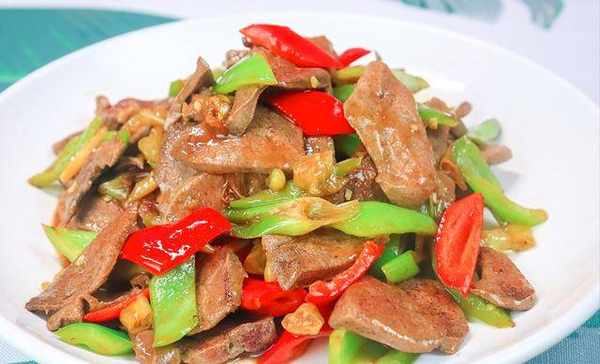 5.锅内留少许底油,放入葱、姜、野山椒翻炒出香味,倒入青红椒片炒至断生,放入猪肝,再倒入准备好的碗料。开大火爆炒10秒钟,再倒入一点米醋,淋入少许明油提亮色泽,翻匀后就可以出锅装盘,美味即成。