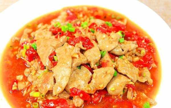5.锅内烧油,油温五成热时,倒入葱、姜、蒜、泡椒翻炒2分钟左右,炒干料头中的水分,料头炒香以后倒入调好的糖醋汁,开大火把汤汁收至浓郁粘稠,起锅均匀浇在猪肝上面,再撒上葱花,美味即成。