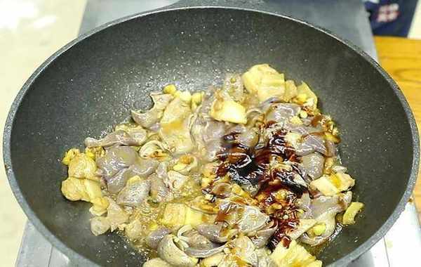 4.锅内再烧油,放入五花片煸炒出猪油,这样成菜才鲜香,五花肉煸香、煸出焦边以后放入姜蒜末一起爆香,淋入适量的生抽、料酒,倒入猪肝,转大火快速翻炒均匀,加入适量的蚝油、老抽上色、胡椒粉,把颜色炒均匀。