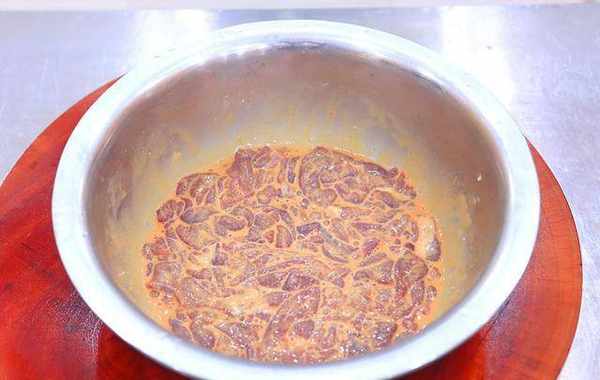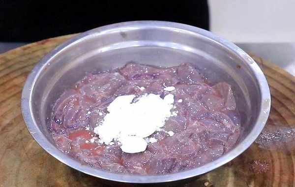 1.准备鲜猪肝一个,去除筋膜,切成薄片放入盆中,倒入适量的啤酒浸泡10分钟,去除猪肝中的毒素和血水,排出腥味。泡好以后使劲地抓揉充分去除里面的血渍,放入清水中多冲洗几次,直到水很清澈为止,挤干水分放入盆中,加入一勺食盐,少许啤酒,10克淀粉抓拌均匀,锁住猪肝中的水分。