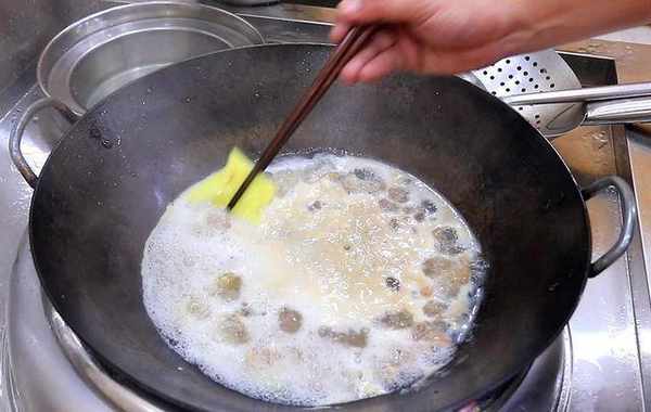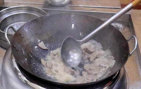 4.锅内多加一点油,油温四成热时放入猪肝,快速滑油10秒钟倒出来控油,滑油的时间过久猪肝容易变硬,口感发老。