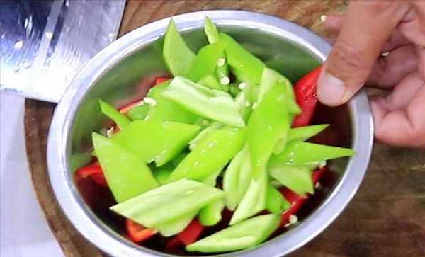 2.准备青椒和红椒各一个,去籽以后切成菱形片,放在一起用来配色;大葱一段,斜刀切成片;生姜一块,切成菱形片;野山椒一把,切成圈。