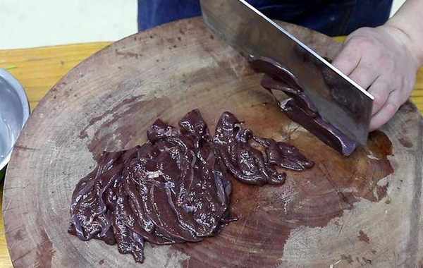 1.准备鲜猪肝一个,打掉上面的筋膜切成片,切好以后用清水多淘洗几遍,一直洗至水非常清澈才可以,充分去除里面的血水,否则腥味太重。