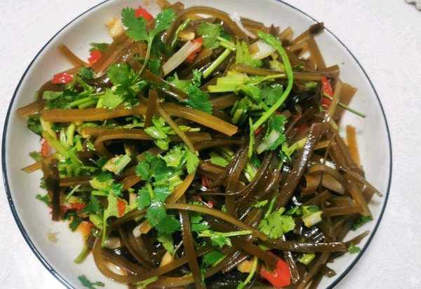 海带,大葱,蒜,小米椒,香菜,生抽,醋,白糖,白芝麻(芝麻酱),盐,鸡精