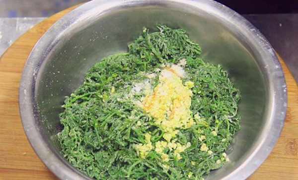 4.4分钟以后立即去除、趁热抖散,放入蒜末、食盐、鸡粉、芝麻香油,拌匀后即可享用。