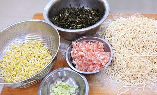 1.芝麻叶提前泡软,多搓洗几遍,一直洗到水非常干净才行,吃着才香、没有涩味,洗好以后把水挤干、切成段,再切点葱花放一起,加盐、香油、十三香拌匀腌一会;一小块五花肉剁成肉末;适量的黄豆芽洗干净,再准备点鲜面条备用。