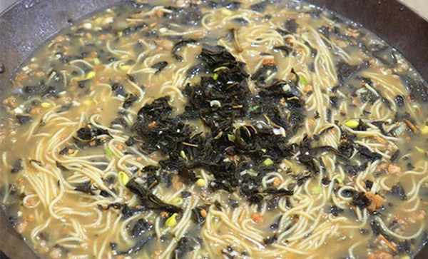3.一直煮至面条全部飘起来,把芝麻叶撒进去继续煮上两三分钟,芝麻叶面条一定要煮的稠糊糊地吃着才浓香。