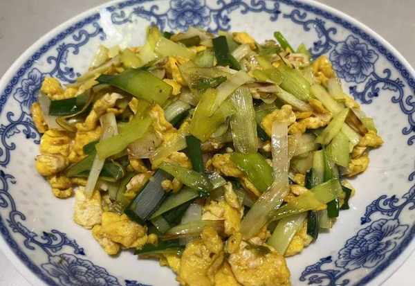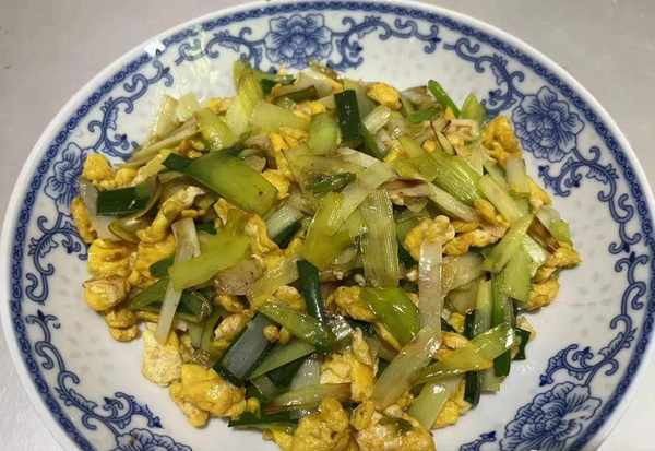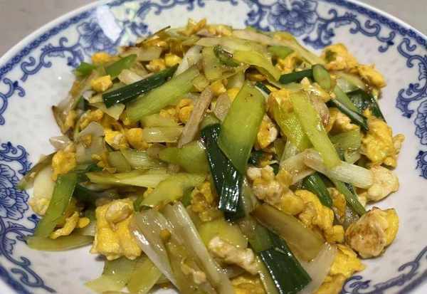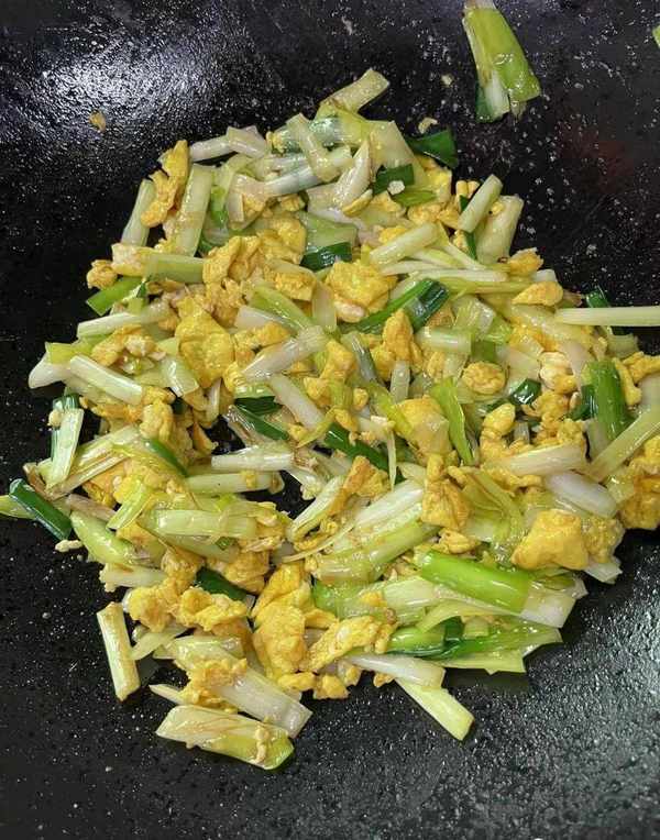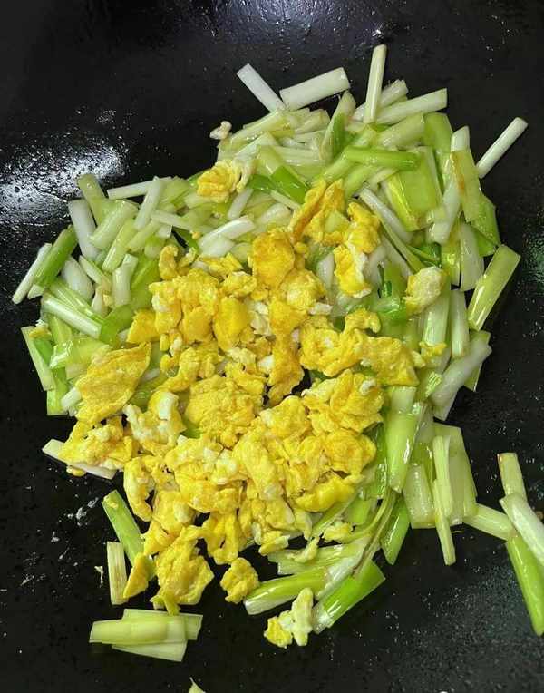 6.食材炒好之后试一下味道,把刚处理好的葱花放入里面,再用铲子给炒均匀就可以关火出锅了。这样子一份美味而营养的韭黄炒蛋就完成,这样做出来的韭黄非常的鲜嫩,而且甘甜好吃,鸡蛋嫩滑营养。
