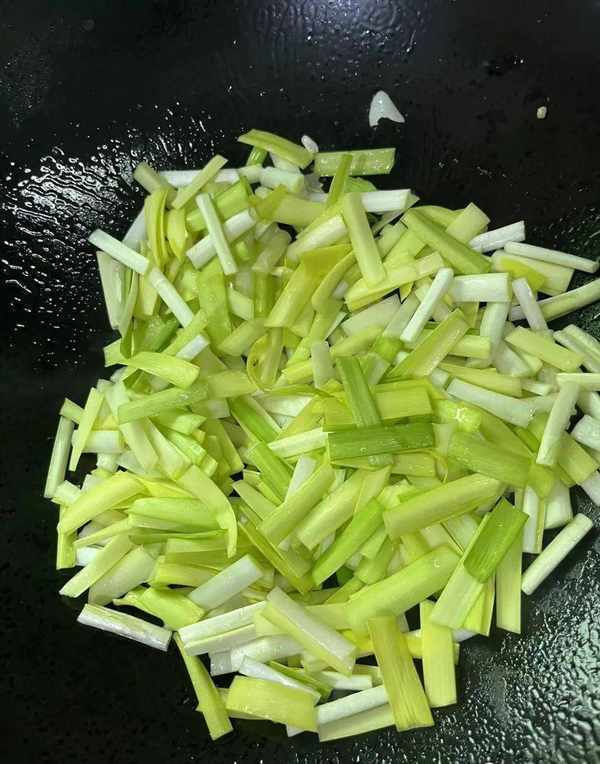 4.锅里面再倒入一点点油,将油烧热。葱段先下锅炒一下,炒出香味来。然后我们再把切好的韭黄段倒入里面,韭黄中含有的水分挺高的,下锅后我们可以用大火快炒,铲子多翻动。