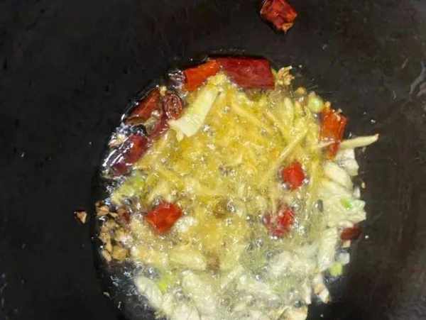 第三步,锅里加入清油烧热,先倒入干辣椒花椒炸出香味,然后放入姜蒜爆炒出香气。