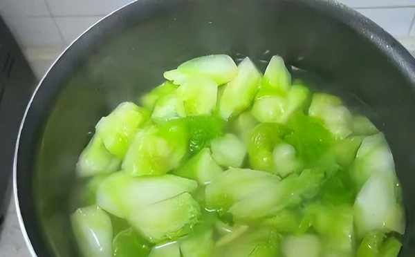 第二步,锅内加入清水烧开,把儿菜,姜片,放入锅中,煮3分钟左右捞出。