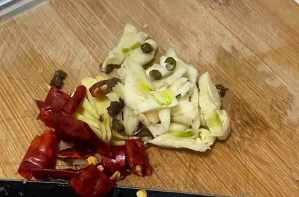 第二步,把姜大蒜切碎,干辣椒切成段,准备几粒花椒。