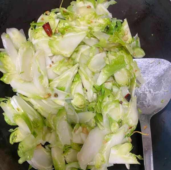 第四步,放入儿菜大火爆炒一会,加入食盐,鸡精,少许清水。