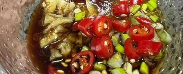 第四步,把配料放入碗中,加入蚝油,酱油,糖,花椒油,芝麻油,香醋,搅拌均匀,做成蘸料。