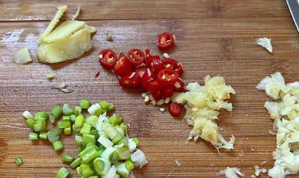 第三步,准备好葱末,姜末,蒜末,红辣椒圈。